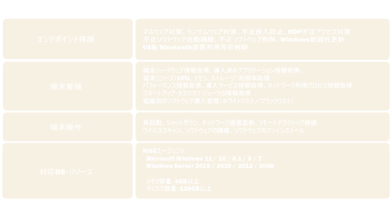 NISEは、クラウド上の統合管理プラットフォームを使用して、脅威を検知した端末にリモート接続し、ウイルスのブロックや削除、脅威調査を行うことができます。