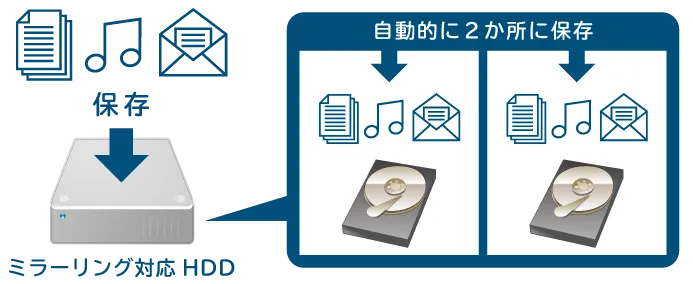 RAID1は、同じデータを2本のハードディスクに書き込みすることで耐障害性を高めた構成です。ハードディスク1本に障害が発生してもシステムは停止せずにデータも失われません。